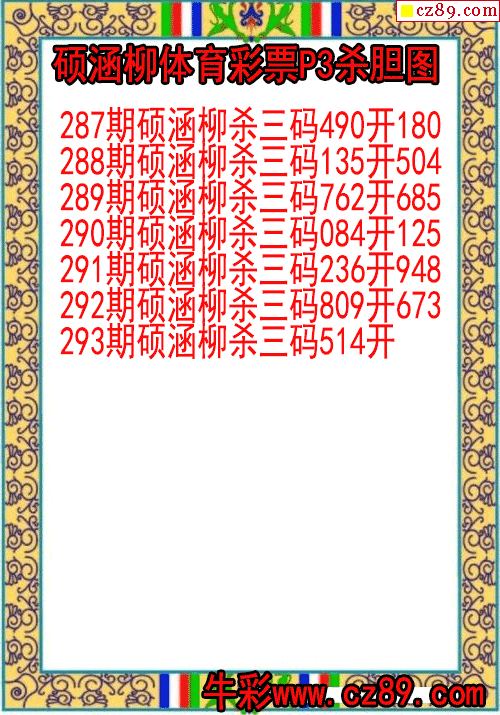 > 25年293期硕涵柳体育彩票P3杀胆图