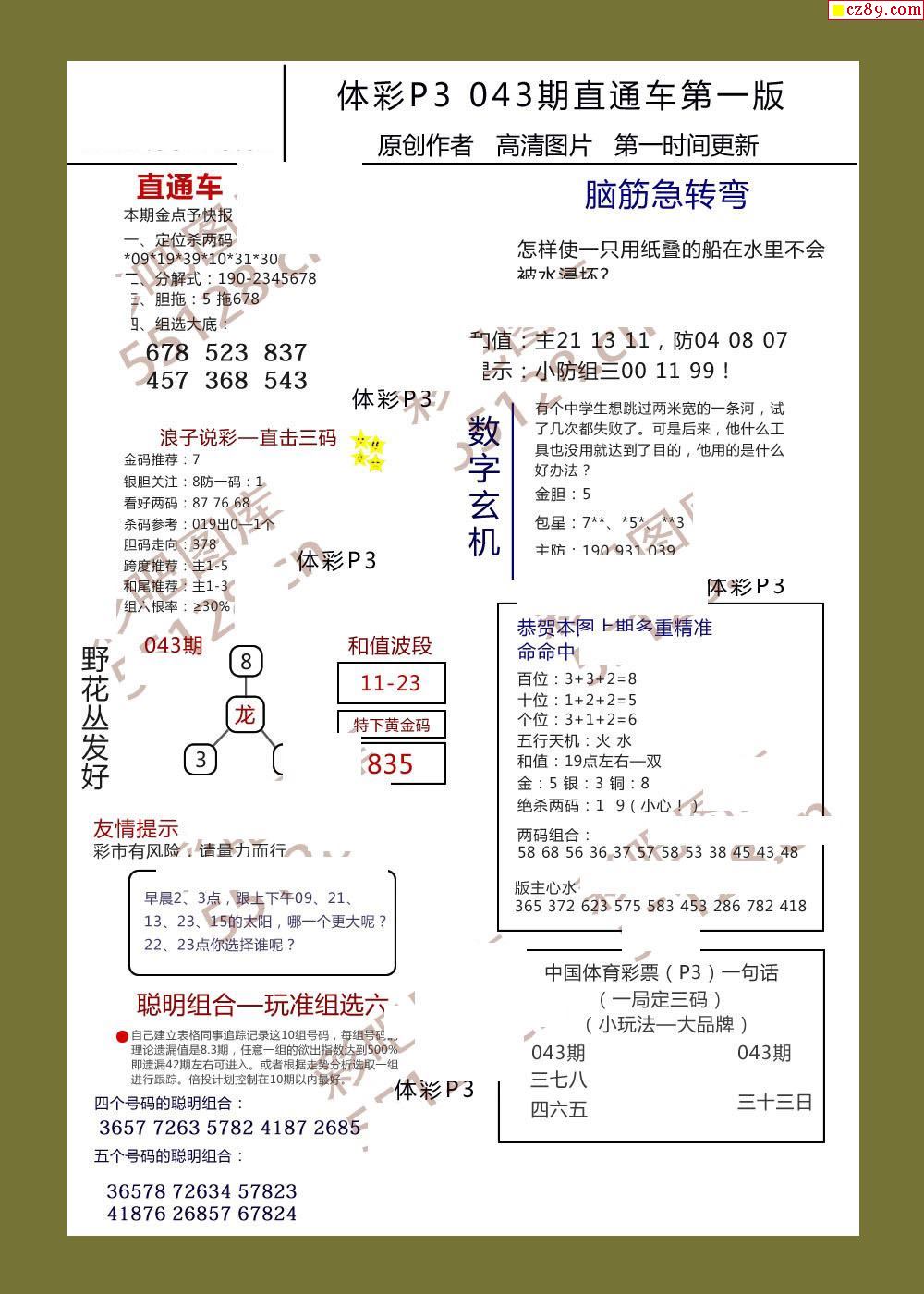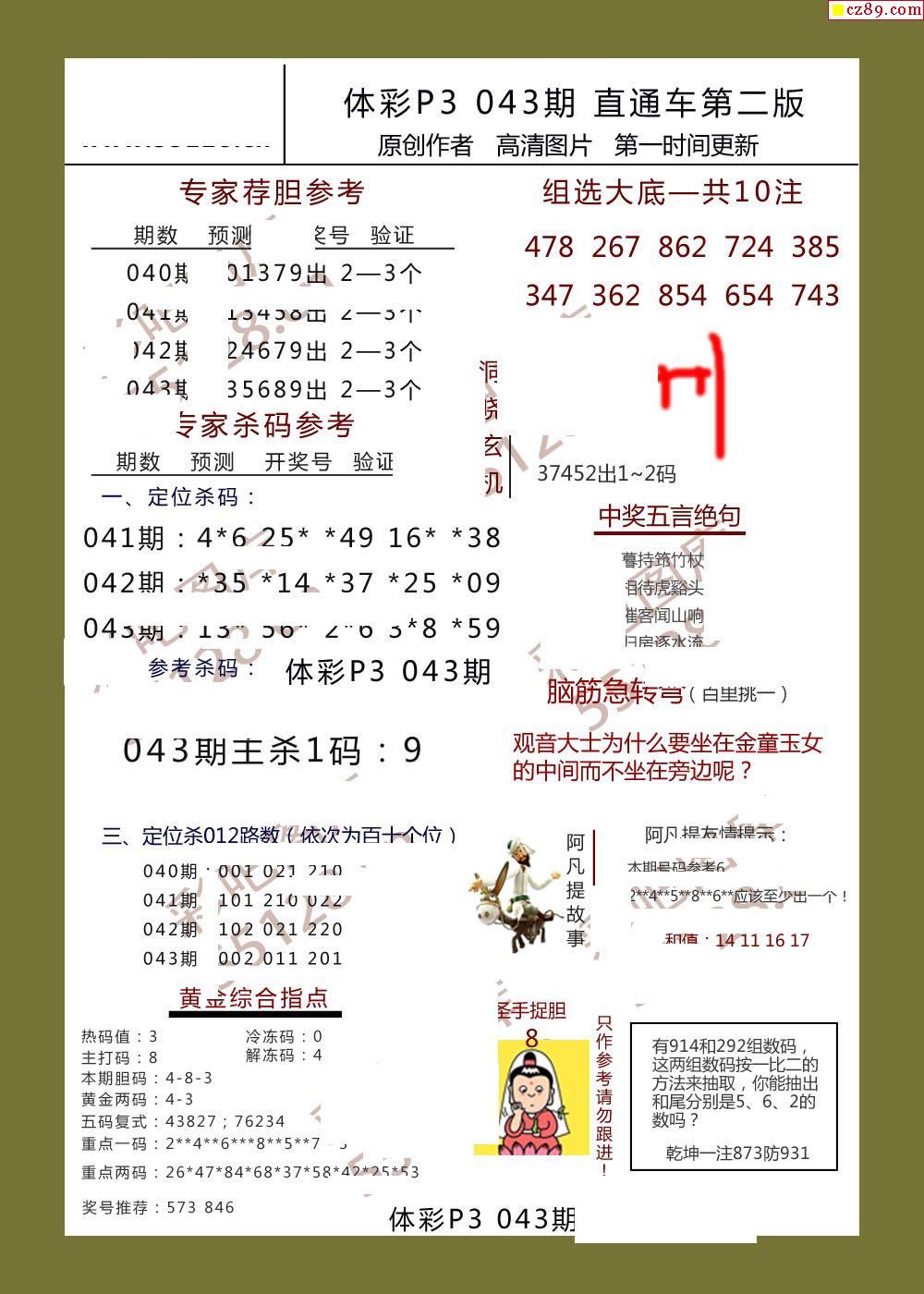 直通车AB版043期体彩p3图谜