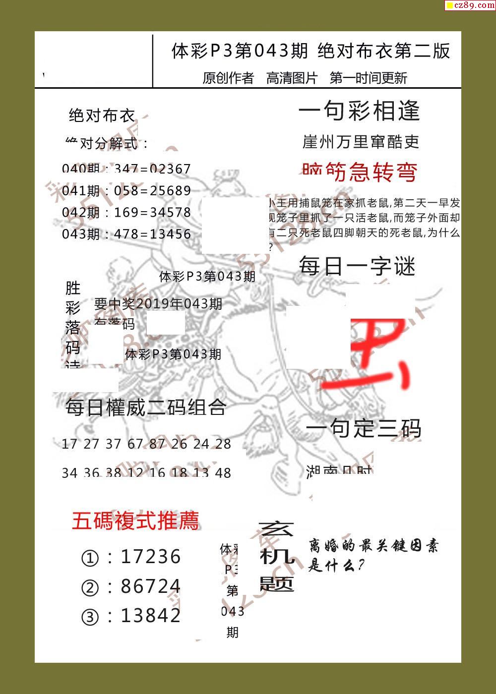 绝对布衣043期体彩p3图谜
